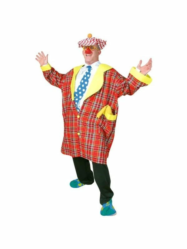 Our Buttons The Clown clown outfit is a great idea for birthday parties, and stage performances. This colorful oversized jacket features a plaid pattern with yellow details. We carry a wide selection of clown accessories to complete this outfit including clown noses, clown shoes and rubber chickens.