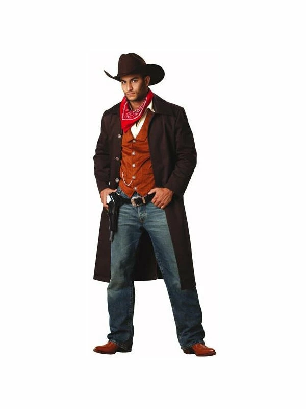 Adult Gunslinger Costume comes with a micro suede vest with attached sleeves and collar, long coat, bandana, toy gun and holster. Pants, belt and hat not included.