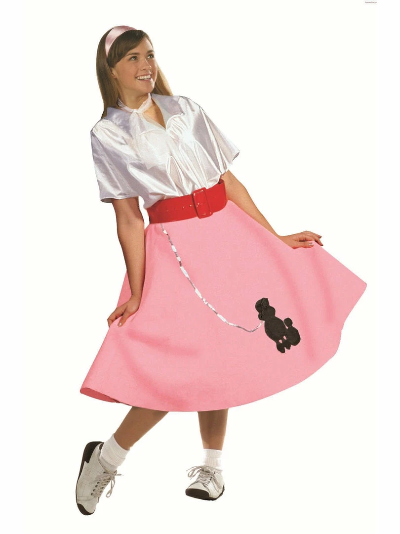 This costume features a white blouse, a poodle skirt of your choice, and a white lace scarf.