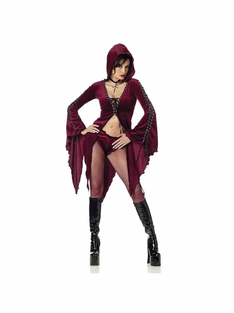 This Sexy Maiden of Darkness costume features a velour top with an attached hood and hot pants. Boots and stockings not included.