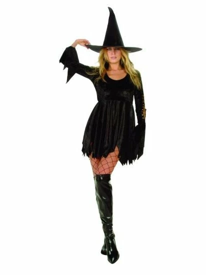 This sexy spell caster costume features a black velvet dress with flared lace up sleeves, an elastic waist, and a character witch hat.