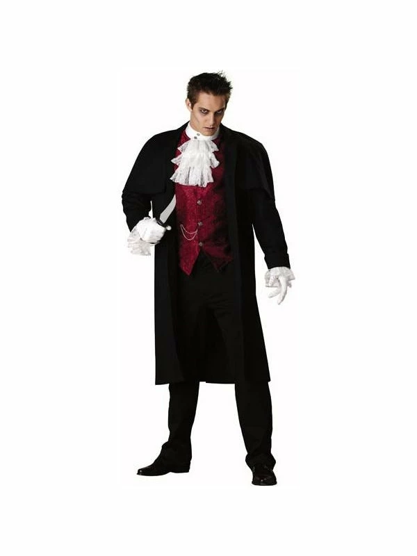 Our Adult Deluxe Jack The Ripper Costume comes with a brocade vest with attached shirt sleeves and ruffle collar, long dress coat with shoulder cape, rubber dagger and white gloves. Pants not included.