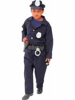 Our Child’s deluxe policeman costume includes a coat, pants, hat and badges. Accessories are not included.