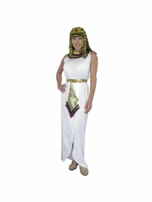 Our Adult Cleopatra Costume features a white sleeveless full length dress, sequin collar, headband and belt.