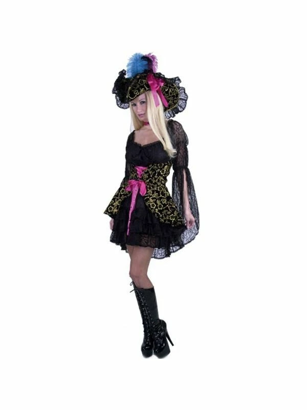 This beautiful and elaborate costume includes a dress, corset and choker. The hat and pirate boots are sold separately.