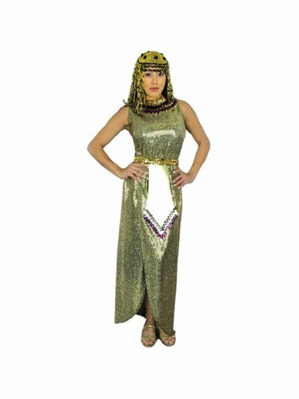 Our Adult Sequin Cleopatra Costume features a gold lame mid drift top with full length slit skirt, sequin collar, headband and belt.