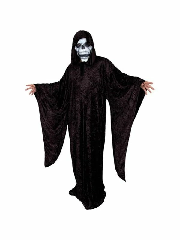Our Adult Grim Reaper costume features a crushed panne full length hooded robe with deep flared sleeves.