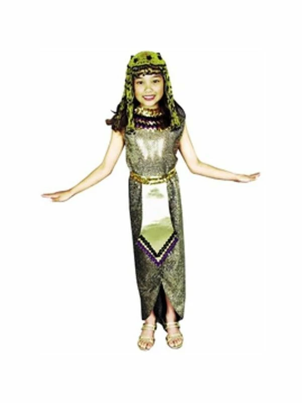 Our kid’s Cleopatra costume features a gold sequin dress, sequin collar, sequin mylar belt and sequin headband. Beaded headpiece is optional and not included.