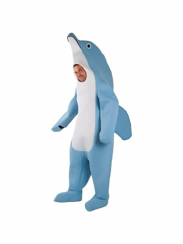 Dolphins are known for their playful disposition and incredible intelligence. There are even reports that they have saved drowning swimmers by guiding them to shore. This light blue dolphin costume is one size and will fit most adults. The single piece featurs velcro enclosure along the back.