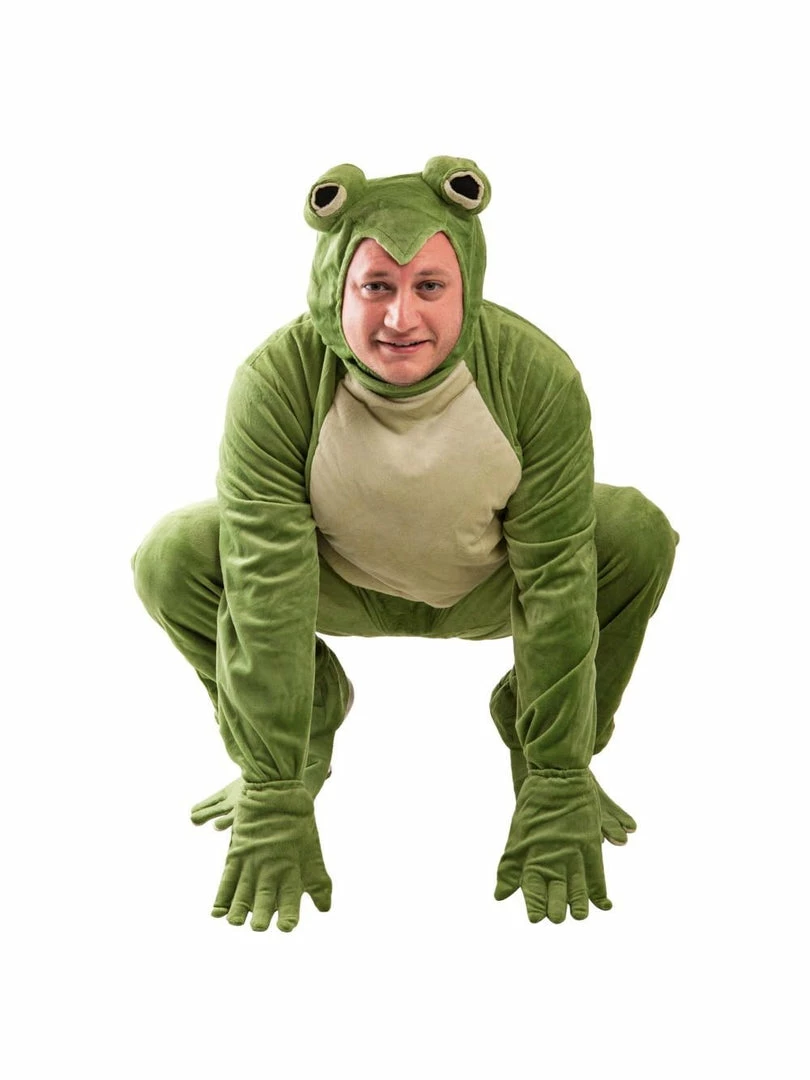 Our adult frog costume features soft, green jumpsuit with headpiece, gloves, and booties for a complete amphibian costume.Â