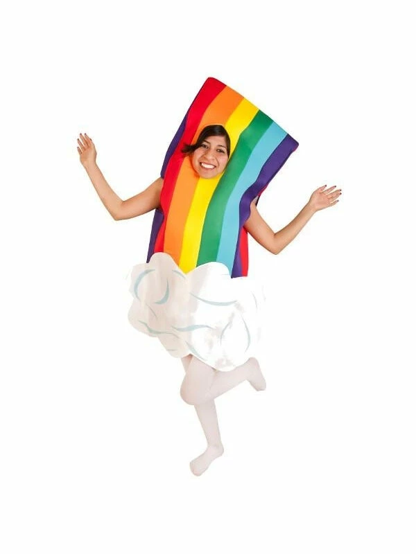 This bright costume features all the colors of the rainbow bursting with joy from a white, fluffy cloud. This one piece costume looks just like the arc of a rainbow with red, orange, yellow, green, blue, and violet. If you want a highly unique costume for Halloween, then this is your look!