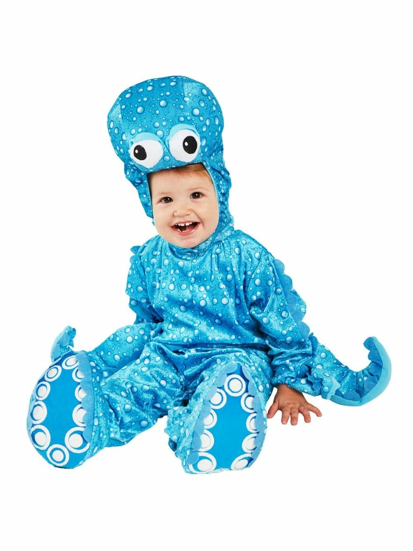 This delightful baby costume features a unique, blue octopus design with tentacles and adorable patterned design.