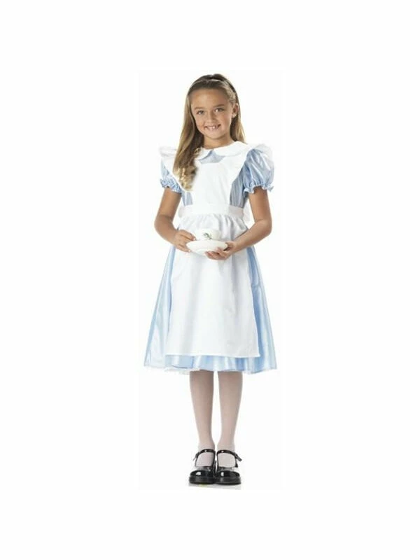 Alice in Wonderland child size Halloween costume. Our kid’s Alice costume features a blue satin dress with white cotton apron & underskirt.