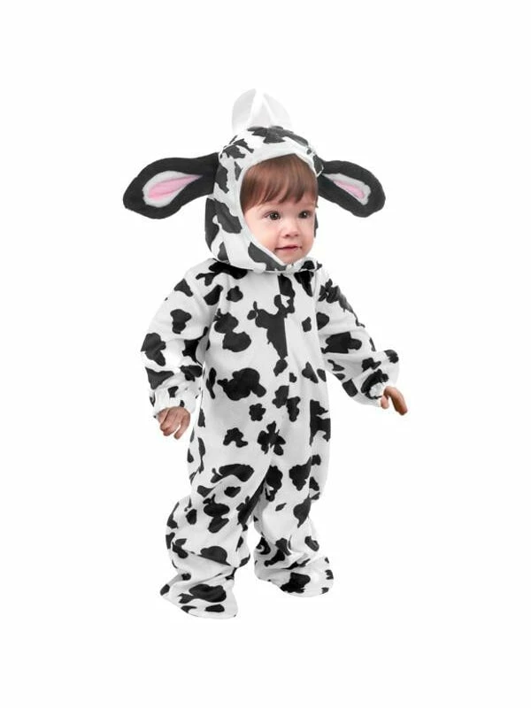 Cows are an essential part of life in America. Great for milk and meat they are kept in farms and fields across most of the country. This cute and cuddly cow costume fits toddlers size 2T-4T and includes a soft jumpsuit with black and white spots as well as headpiece with plush ears.