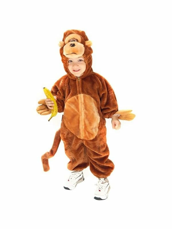 This toddler plush monkey costume is warm n’ fuzzy all over.