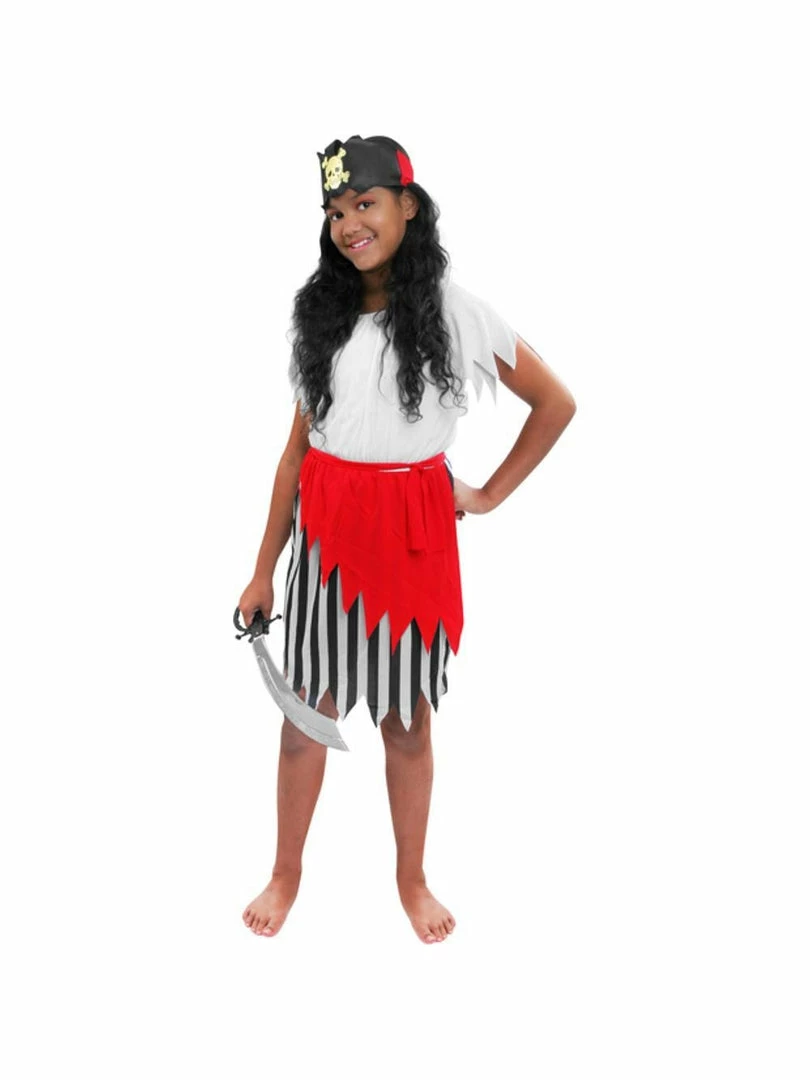 This Child’s Carribean Girl Pirate Costume is great for gathering loot and finding lot’s of candy treasure this Halloween.