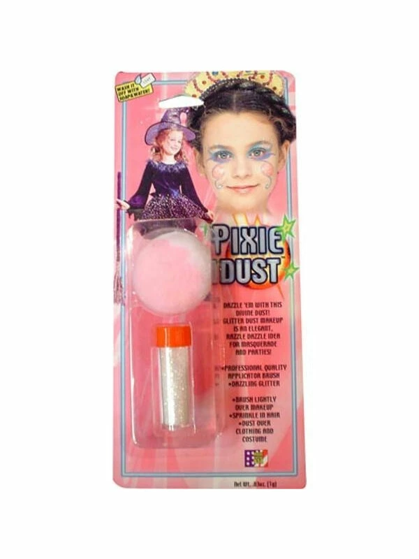 Pixie glitter dust with soft puff applicator. Dazzle’em with this divine dust. Ideal for masquerades or parties. Just sprinkle glitter onto powder puff and dust onto skin or in hair.