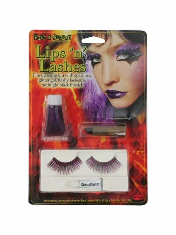 Purple halloween lipstick eyelash Make Up kit. Flashy lashes with lips so sweet, the perfect duo for trick or treat.