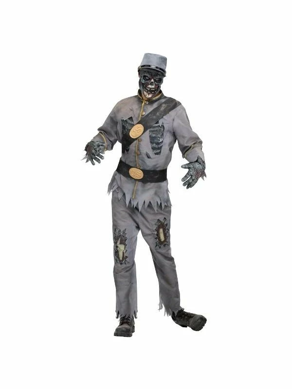This ghoul costume features a grey jacket with an attached bandolier, matching pants, a black belt with a gold CS logo, a character hat, zombie gloves, and a character mask.
