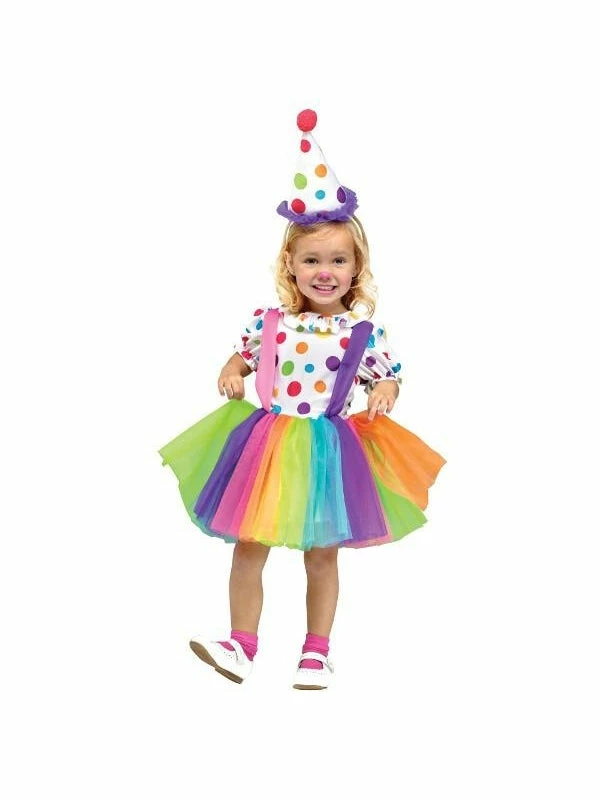 Big top fun comes to trick-or-treating this year with our adorable children’s circus clown dress. With a big, bright rainbow skirt and adorable headband hat, your toddler can clown around for Halloween or just while playing regular everyday dress-up. For a fun family or group costume idea, consider our other circus-themed or clown costumes.