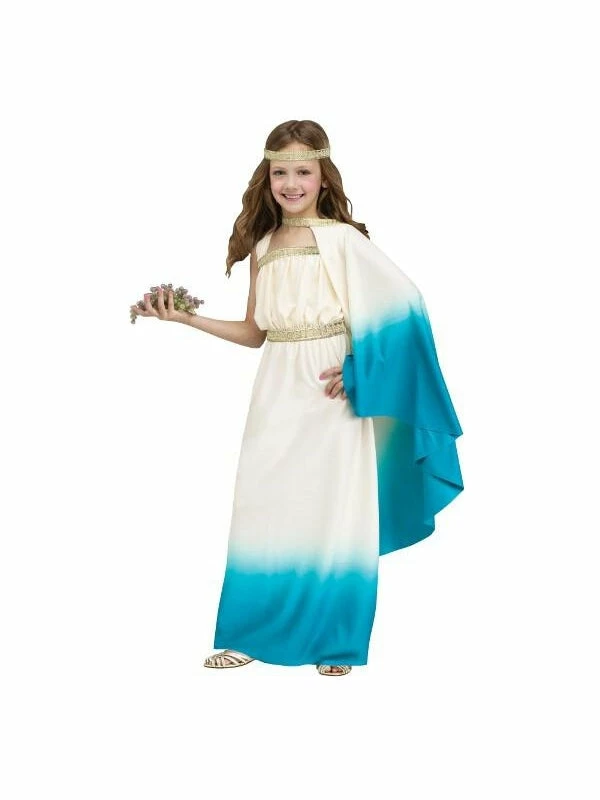 This Greek Goddess costume features a white and blue gown with a gold belt, and a matching gold headband.