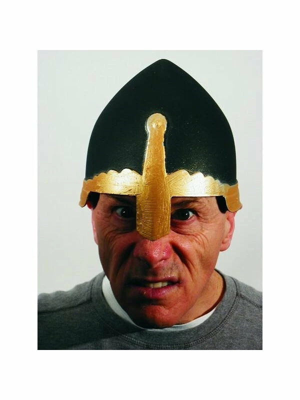 This hard plastic helmet looks like a crusader helmet from the middle ages and fits most adults.