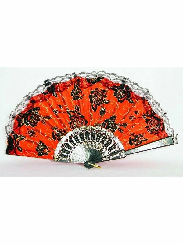 This red, black, and white fan is essential to any Dia de los Muertos outfit. It features a traditional roses pattern with frills and, of course, plenty of blood-red.