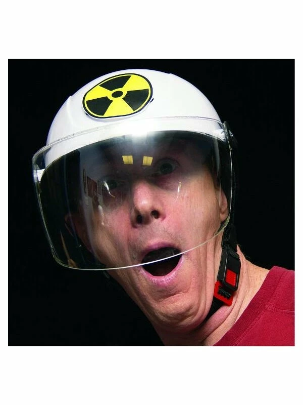 This nuke helmet includes the distinctive nuclear symbol, an eye shield, and a chin strap.