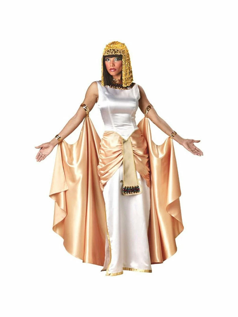 Adult Fancy Cleopatra Costume comes with a full length satin gown with attached waist sash, gold apron drop, sequin collar, long cape and beaded headpiece.