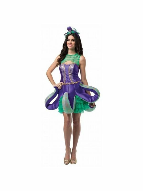 This cute new octopus costume features a purple octopus dress with a green ruffled underskirt and collar and a matching character headpiece.