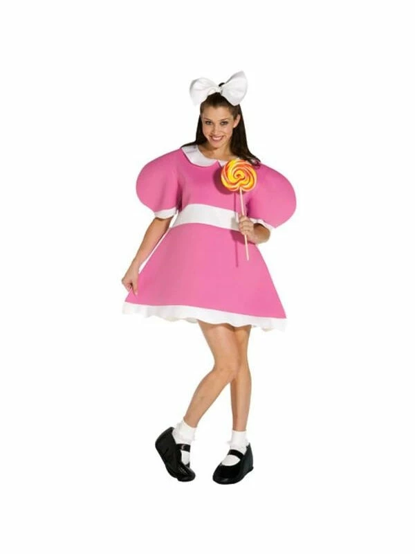 Adult Wind-Up Girl Doll Costume includes one piece dress and Mary jane shoe covers. Lollipop not included.