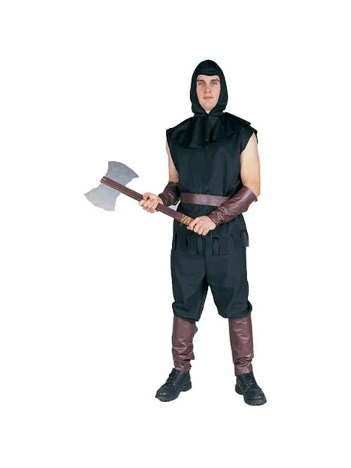 Our adult executioner man costume includes a top, pants hood, cuffs, belt and boot tops.