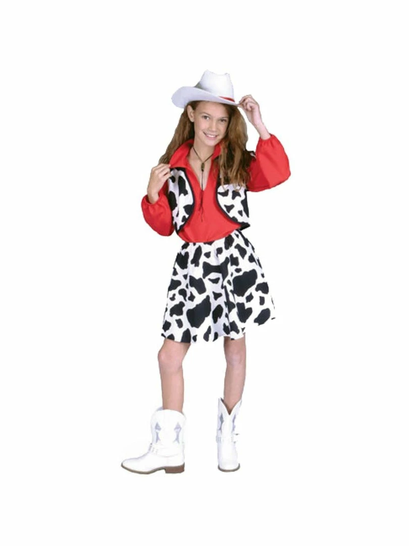 Our Child’s cowgirl costume includes a cow print vest and skirt. Cowgirl hat is not included