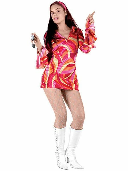 This sexy 60s chick costume includes a cute dress and headband. Glasses, stockings and shoes sold separately.