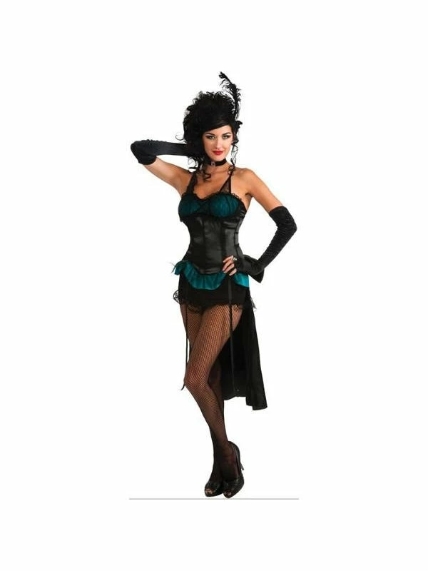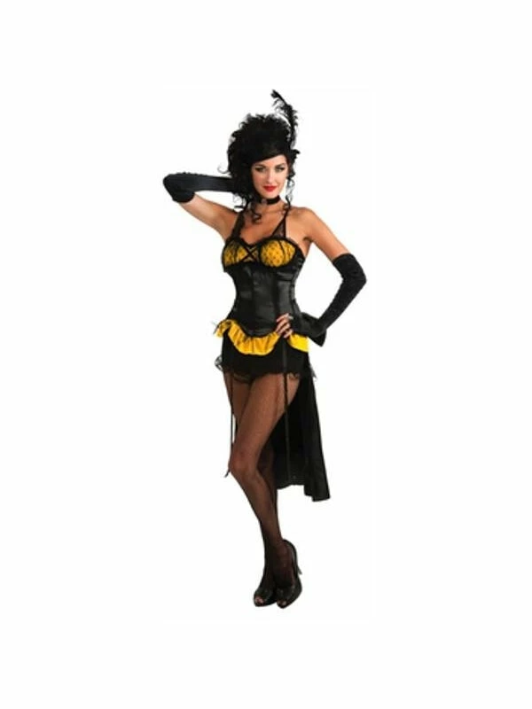 This sexy saloon girl has a black corset offset with bright yellow or blue in the bust and waist for a vibrant appearance.