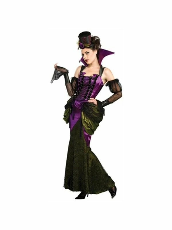 In the of Queen Victoria fashion was truly elegant and refined. Make no mistake, this dark mistress is no peasant! The long, Victorian style dress is a deep purple tone with green and black accents for a perfectly wicked ensemble of darkness.