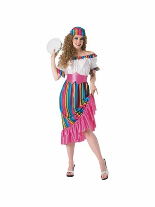 This Latina costume has all the spice of traditional Mexican clothing with just a bit of extra pink. The one piece dress falls below the knees and features a loose fit top for a classical look.