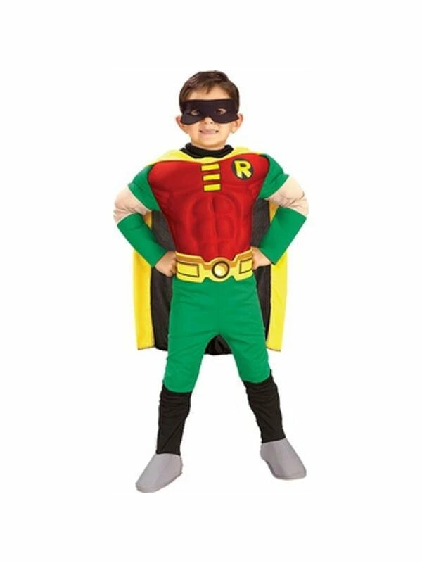 Child’s Deluxe Muscle Chest Robin Costume. Includes muscle chest jumpsuit, cape, headpiece, belt and boot tops.