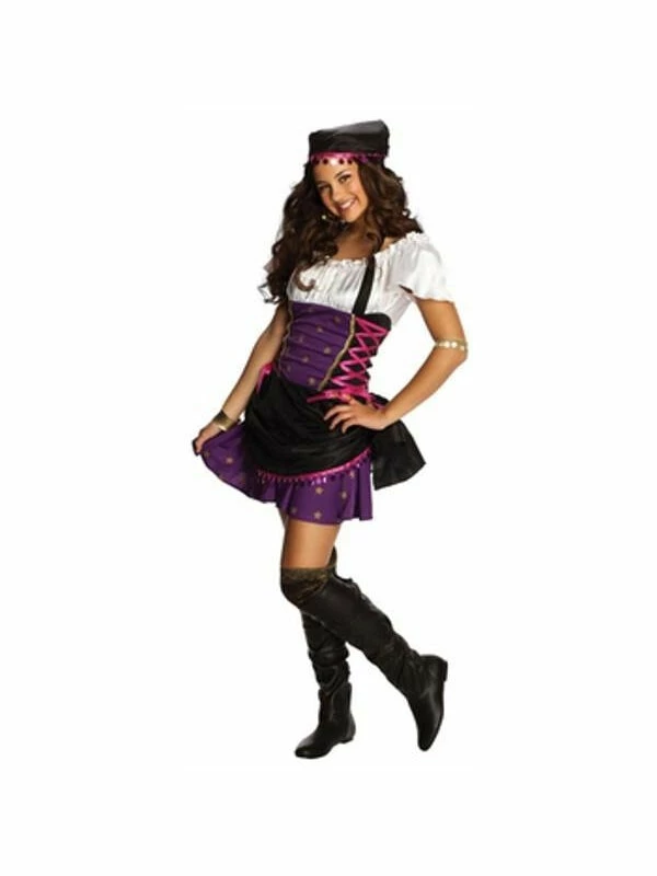 The funny thing about gypsies, is that nobody likes them, yet we’re all fascinated with their fashion and culture. Do your part to continue the great paradox with this cute gypsy costume. The purple dress has black and pink accents for a striking, yet simple look.