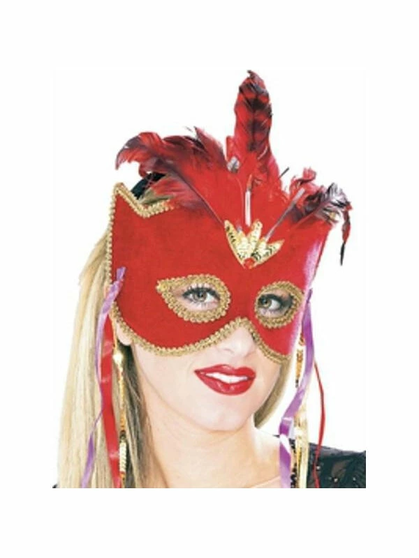 - One red velvet Venetian mask with gold accents