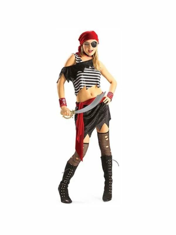 Teen Ragged Pirate Costume. Includes top, skirt, wrist cuffs, sash and headscarf.