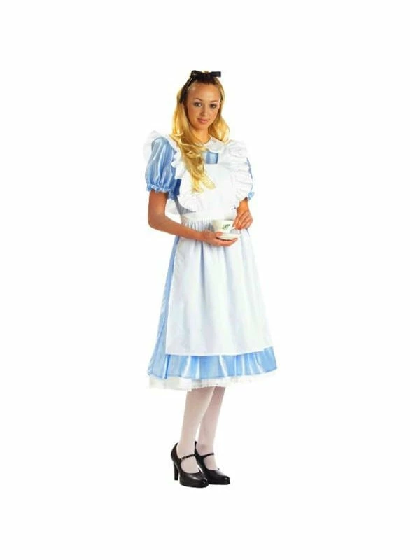 Our adult Alice dress is a comfortable character costume great for parties and group costume ideas. Finish the outfit with a pair of tights and sexy shoes. Be Alice in Wonderland this Halloween.