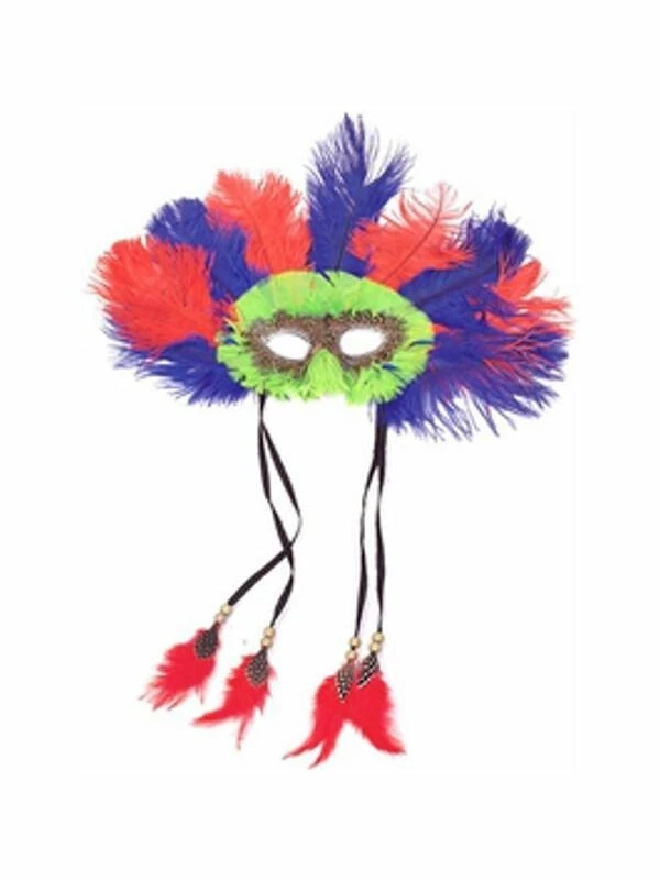 Lime feather eye mask with blue and red feather accents.