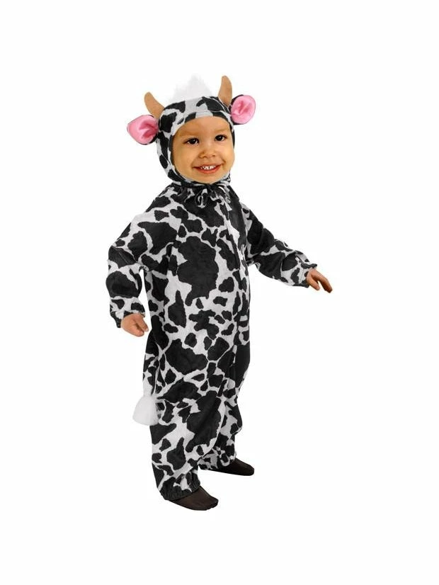 Our Cow Toddler costume features a panne jumpsuit with attached tail, hood with ears, horns & shag hair.